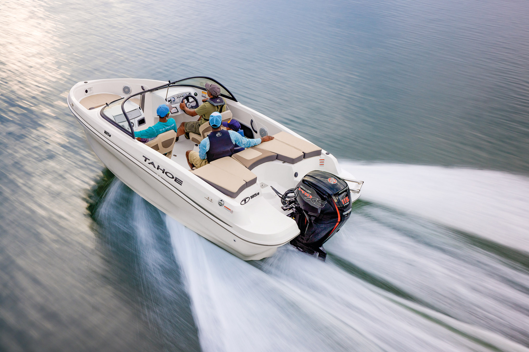 The 2025 TAHOE® 185 S comes standard with a 115hp Mercury® EXLPT Pro XS® FourStroke outboard motor and has a recommended maximum 150hp rating. This model is packaged with a trailer.
