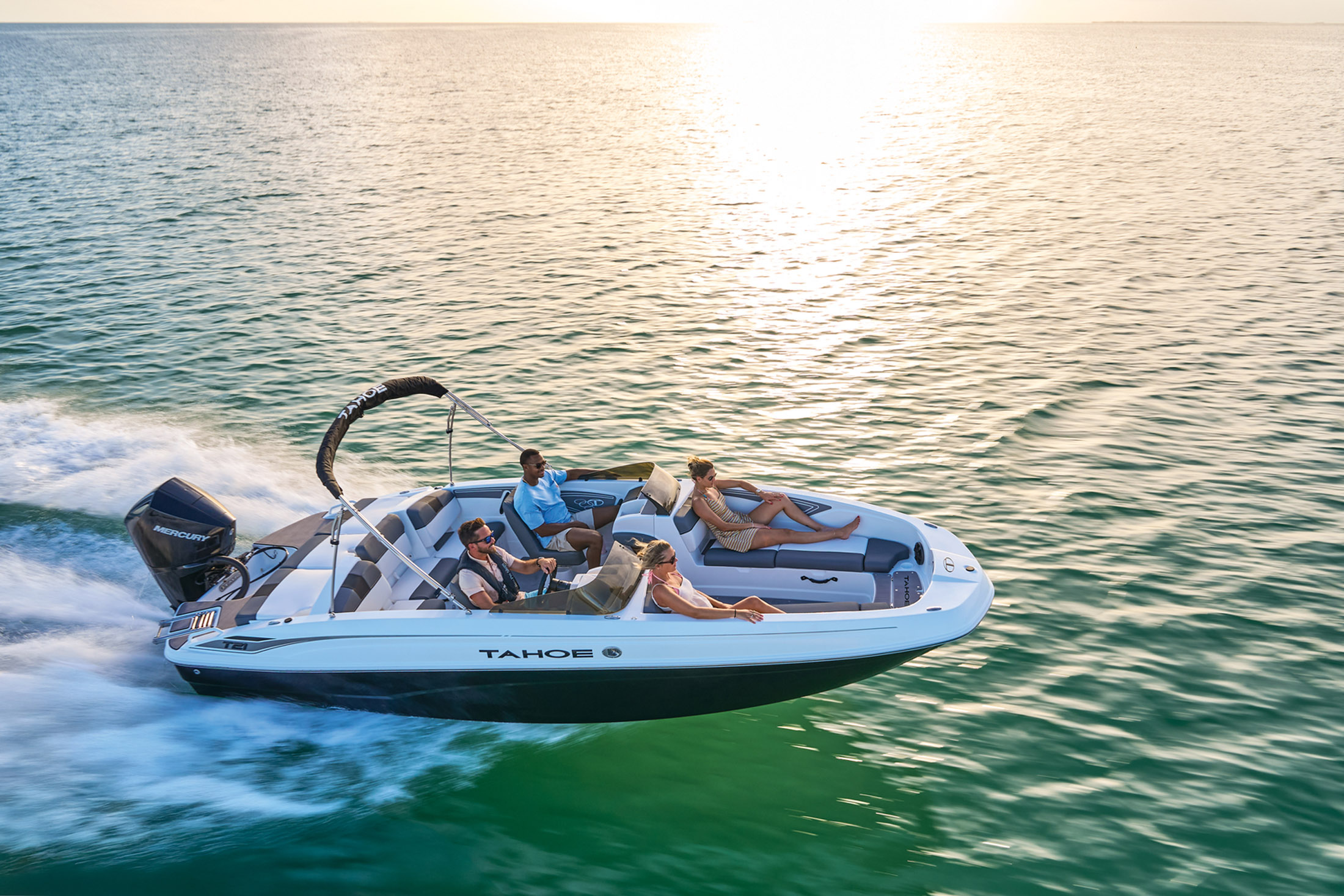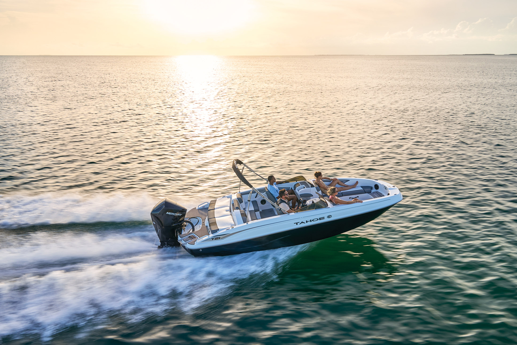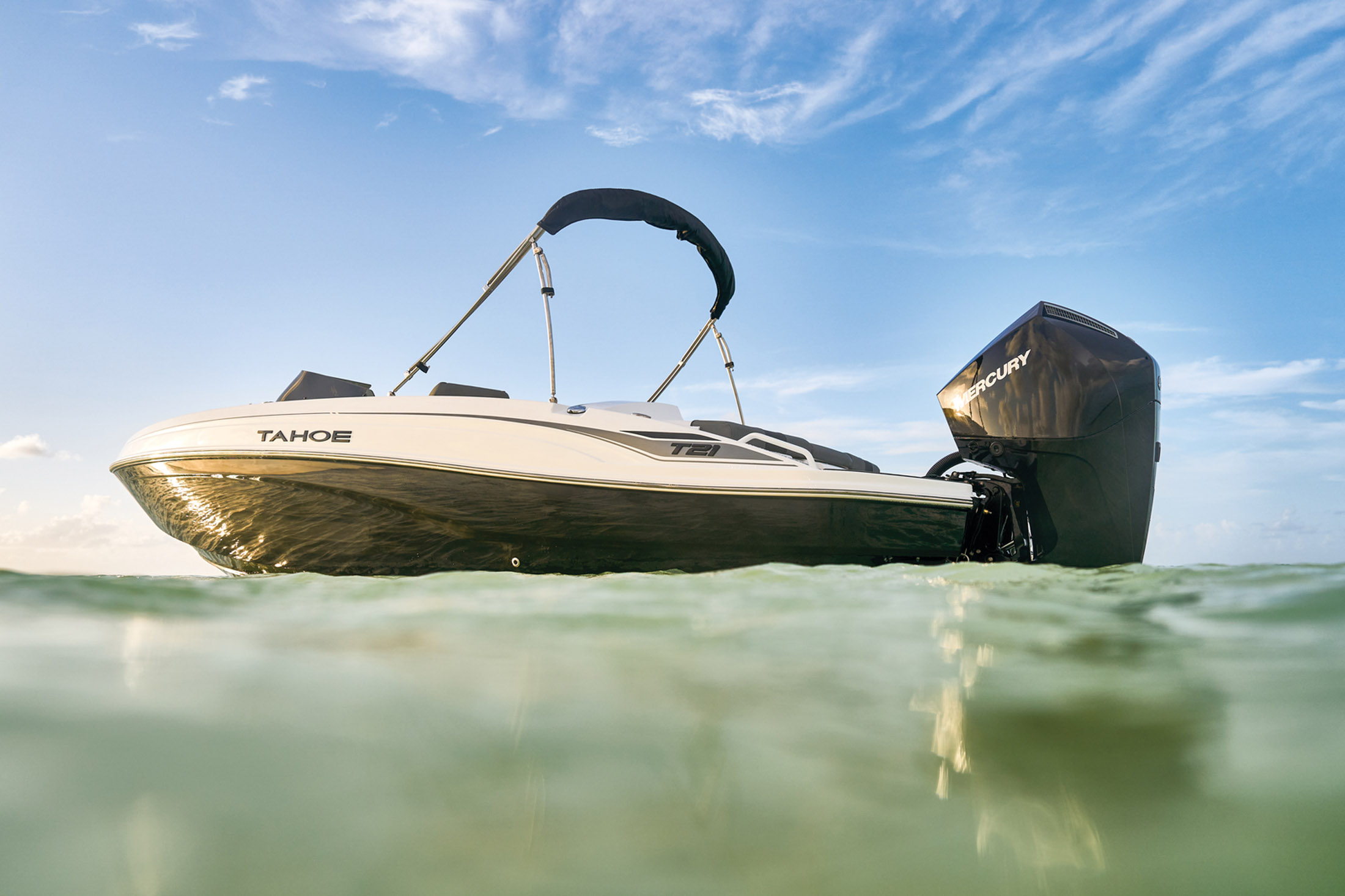 The 2026 TAHOE® T21 comes standard with a 150hp Mercury® XL Pro XS® FourStroke outboard motor and has a recommended maximum 200hp rating. This model is packaged with a trailer.