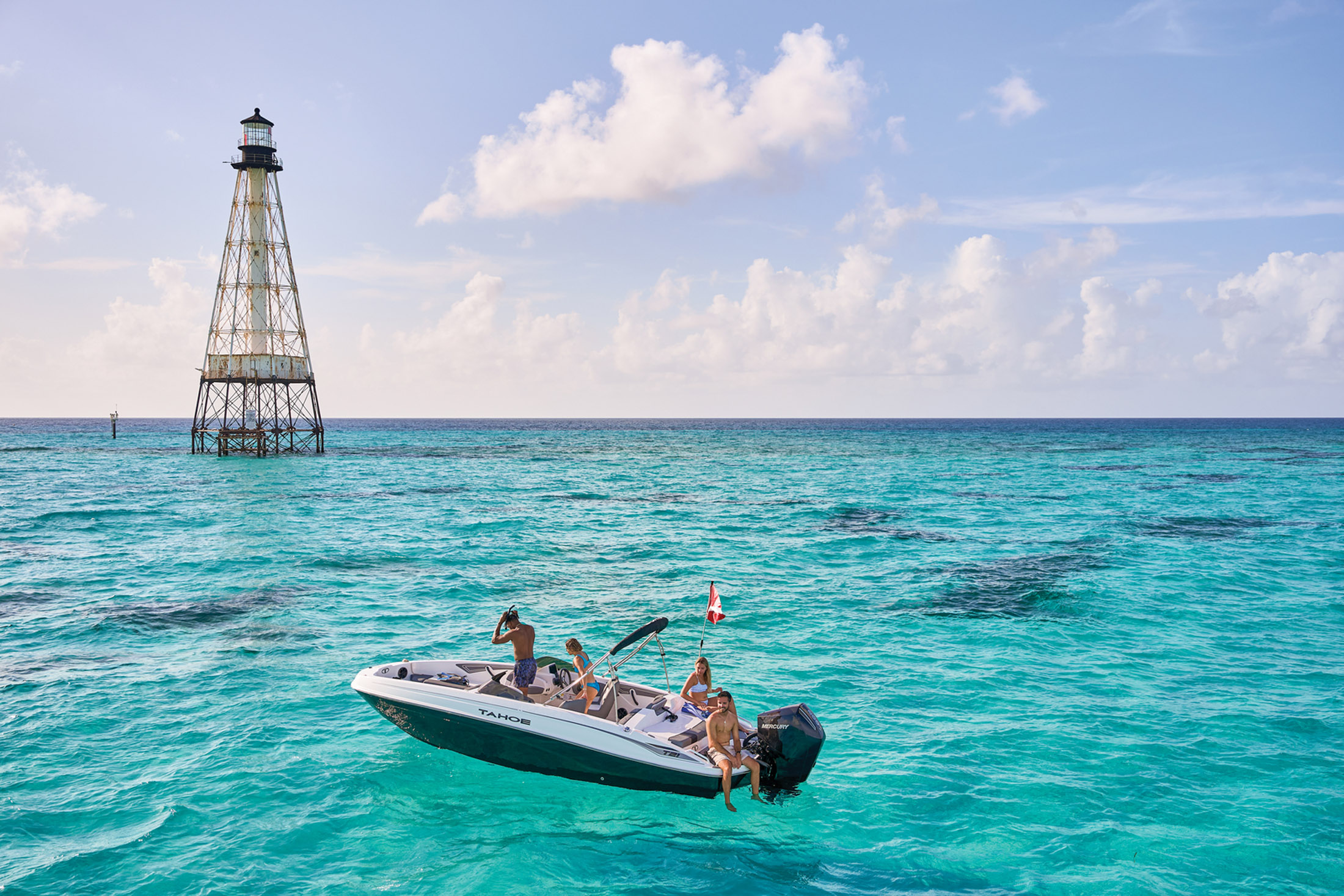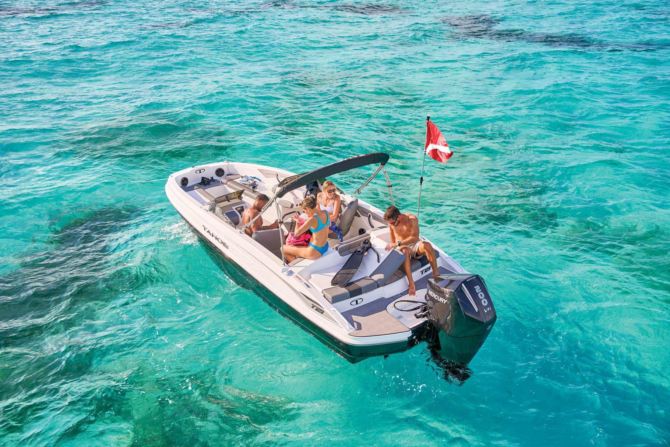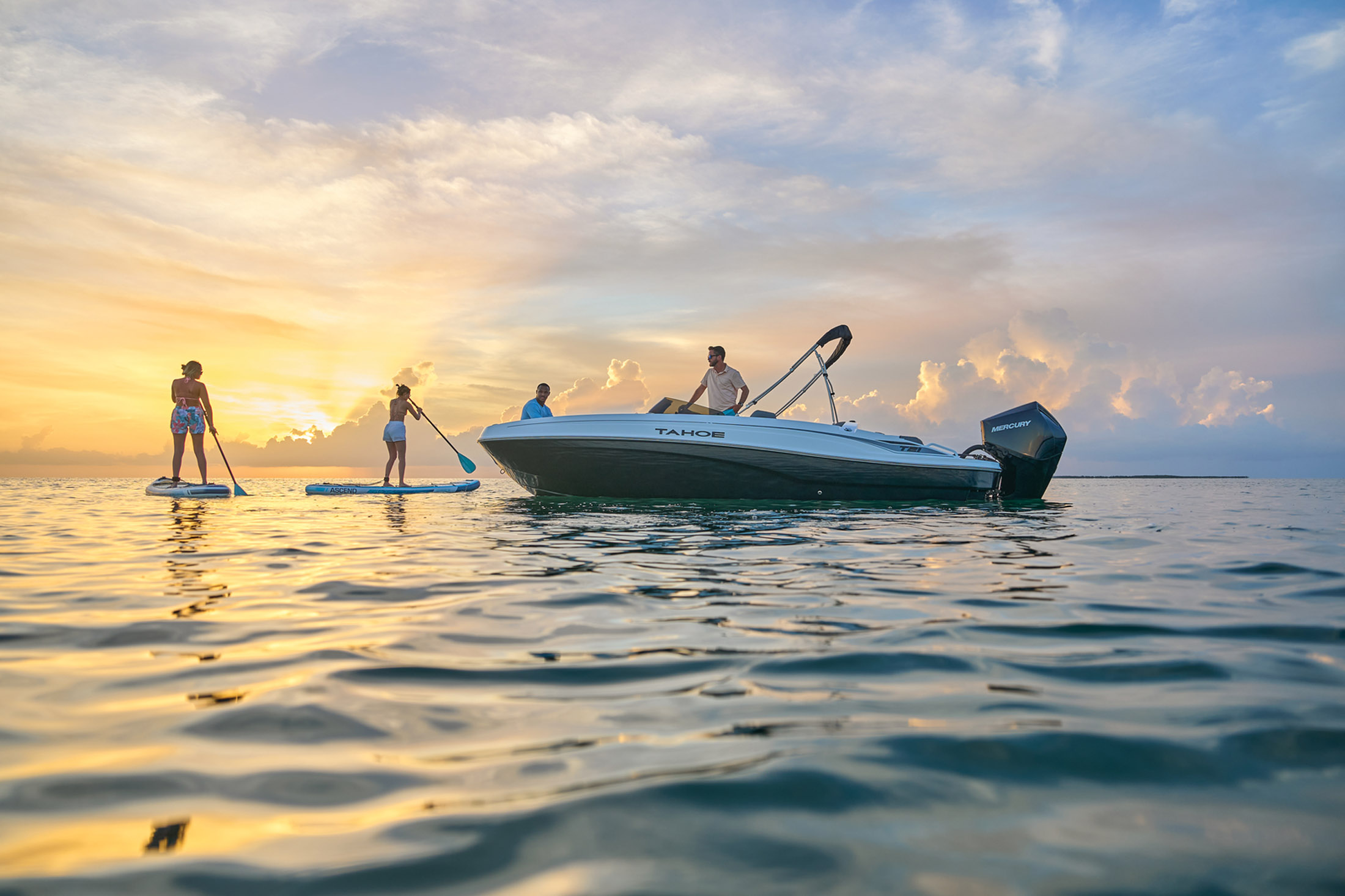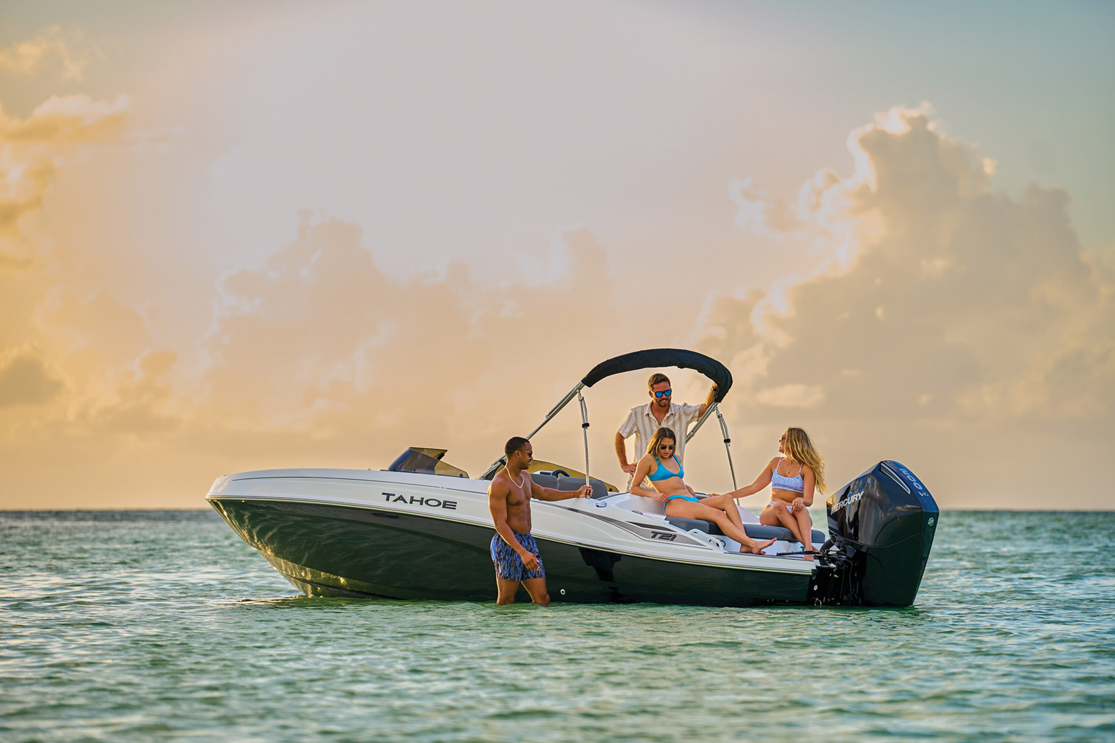 The 2026 TAHOE® T21 comes standard with a 150hp Mercury® XL Pro XS® FourStroke outboard motor and has a recommended maximum 200hp rating. This model is packaged with a trailer.