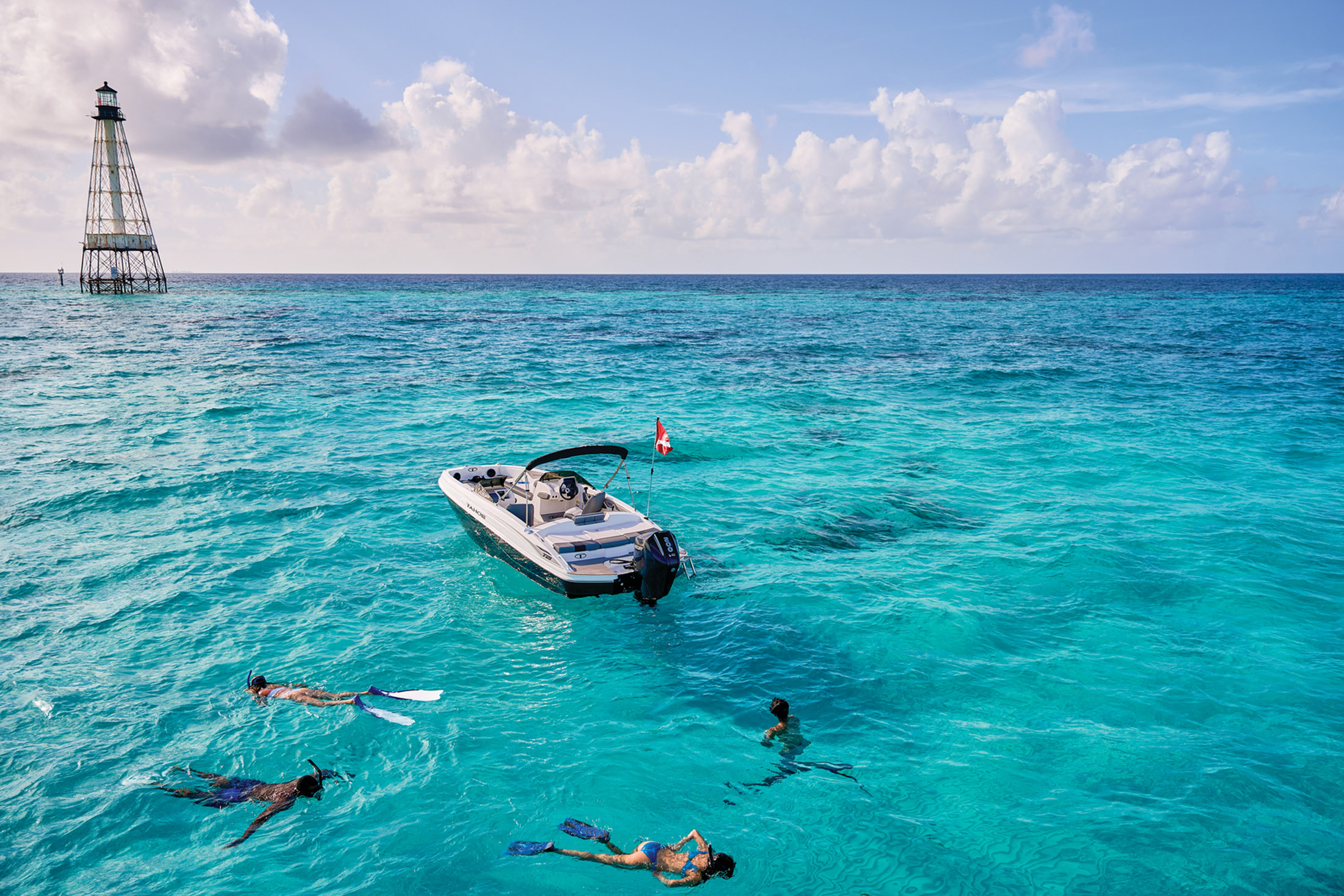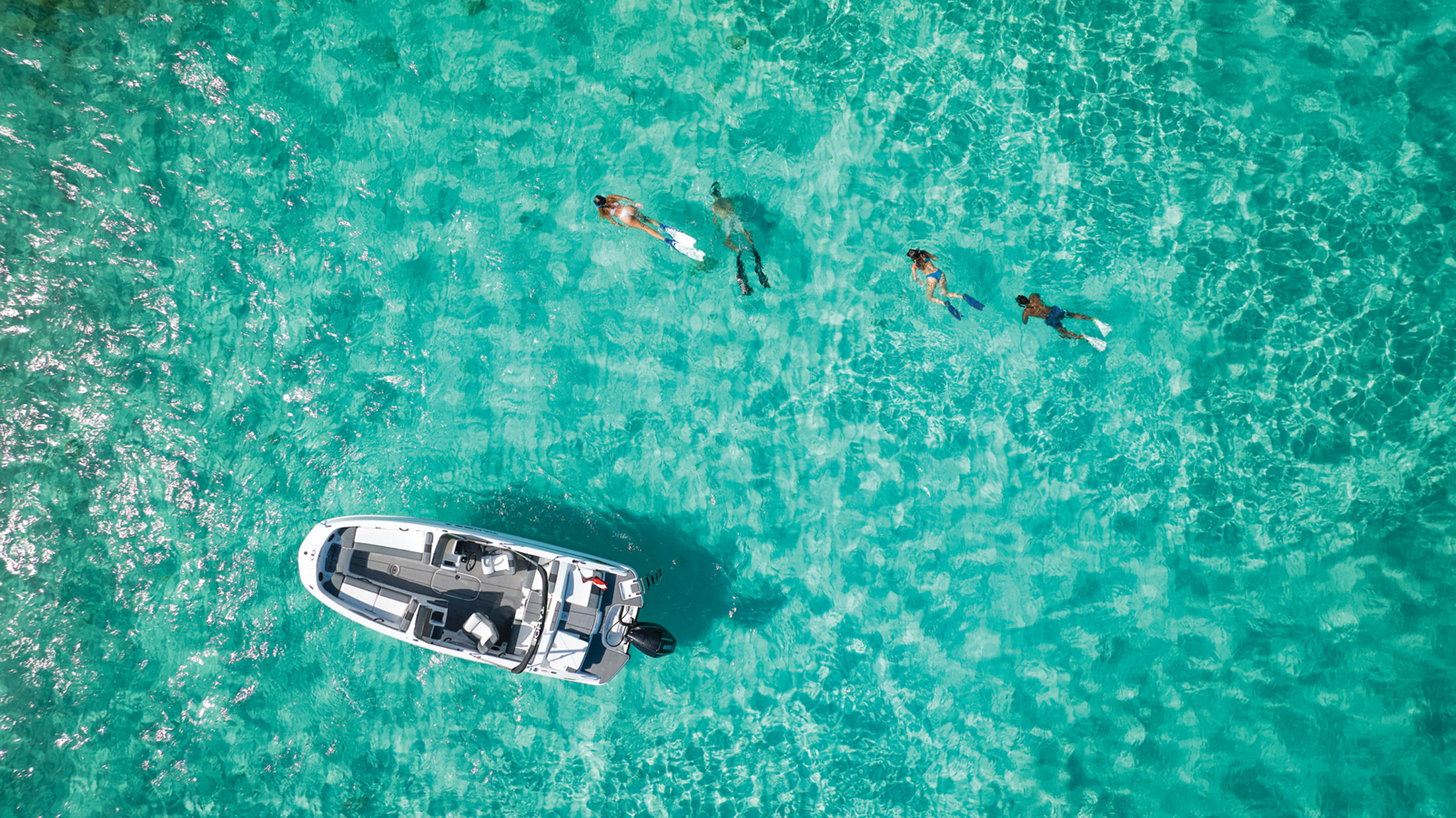 Take your places in the luxurious dual forward lounges, dual midship bucket seats, and the aft 3-across bench. You’ll find space for your gear and supplies under the seats and sun-pad cushions, consoles, and the in-floor storage compartment. When you’ve found a cove you want to explore, the anchor locker, dual aft swim platforms, and telescoping ladder make diving into the waters and getting back into the boat easy.