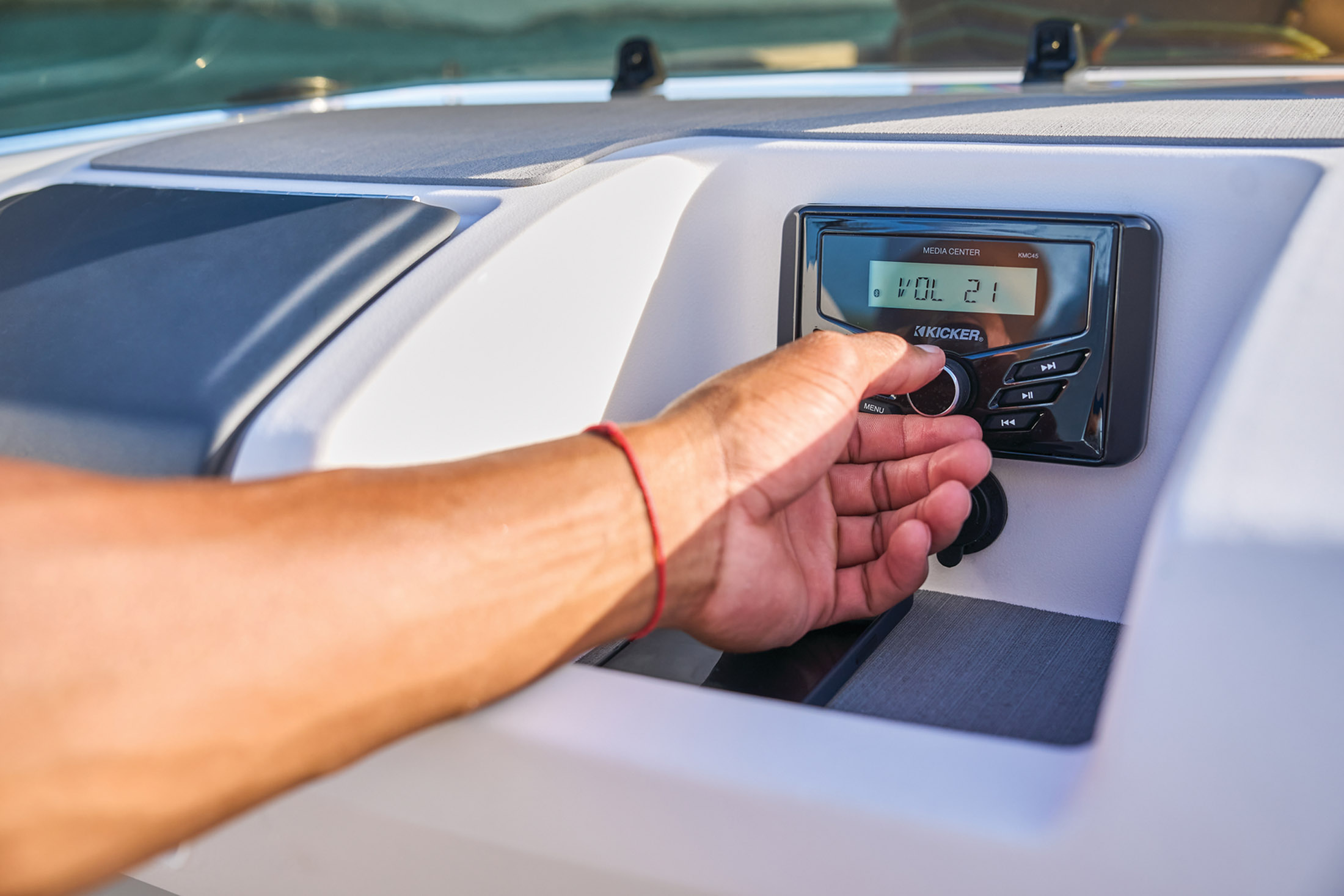 The passenger console presents a KICKER® bluetooth stereo supported by four speakers throughout the interior. Directly beneath the stereo, you'll find a padded phone managment station.